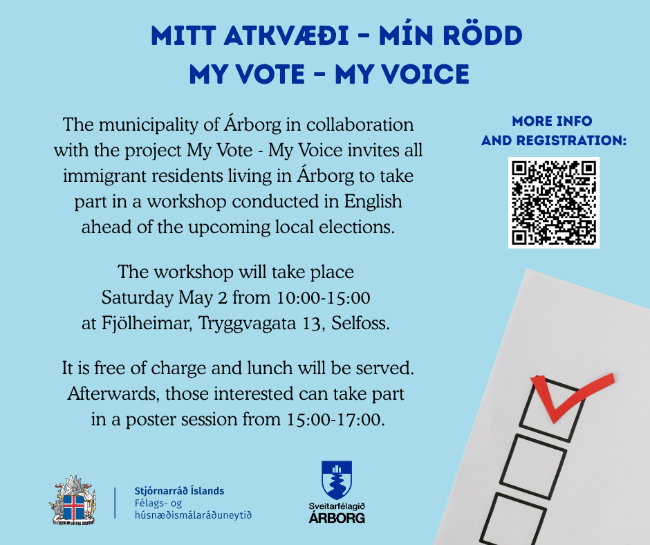 Sveitarfélagið Árborg í samstarfi við verkefnið „Mitt Atkvæði – Mín Rödd“ býður öllum innflytjendum sem búa í Árborg að taka þátt í vinnustofu sem haldin verður á ensku fyrir komandi sveitarstjórnarkosningar.